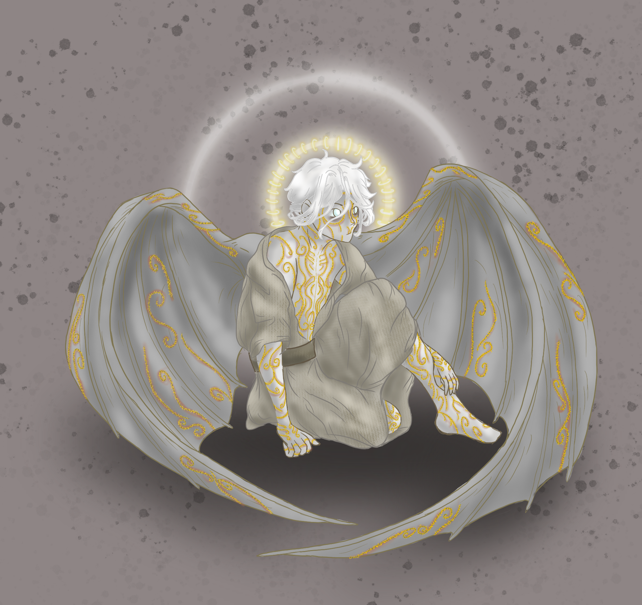 This is a drawing of a Dungeons and Dragons character named Icarus, They are a fallen angle betrayed by there god. Because of them being an angelic creature they have golden blood and they cant heal in a normal way so they sew there wounds closed with golden thread, there's also all of the marking left on them from there god, theses are all of the patterns left on them that you can see. I made this character with the part of me to process how I feel about high powers of government. Icarus's story consisted a lot of them trying to find who they are as an individual, with the world being a strange and scarry new place with no guidance about how there supposed to live.