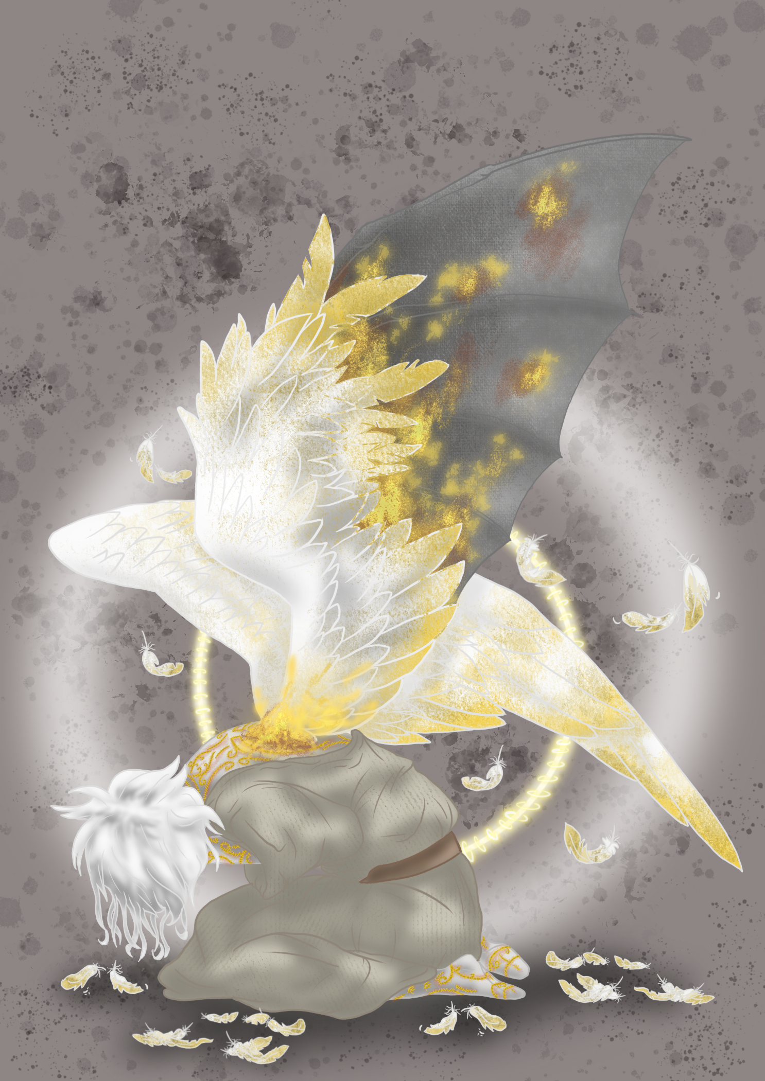 This is a drawing of a Dungeons and Dragons character named Icarus, They are a fallen angle betrayed by there god. Because of them being an angelic creature they have golden blood and they cant heal in a normal way so they sew there wounds closed with golden thread, there's also all of the marking left on them from there god, theses are all of the patterns left on them that you can see. I made this character with the part of me to process how I feel about high powers of government. This the from when they lost faith and were betrayed by there god. Icarus's story consisted a lot of them trying to find who they are as an individual, with the world being a strange and scarry new place with no guidance about how there supposed to live.